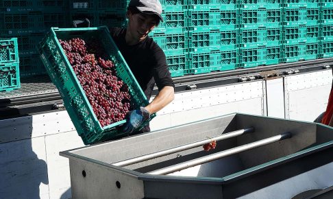 山梨よりマスカット・ベーリーAが続々と入荷し始めました。 今年は色づきもよく、糖度も高いぶどうです。 新しい除梗機はローラーの上を粒がコロコロと転がりながら隙間から下に落ちる仕組みなのですが、一部粒が大きいものはそのまま…