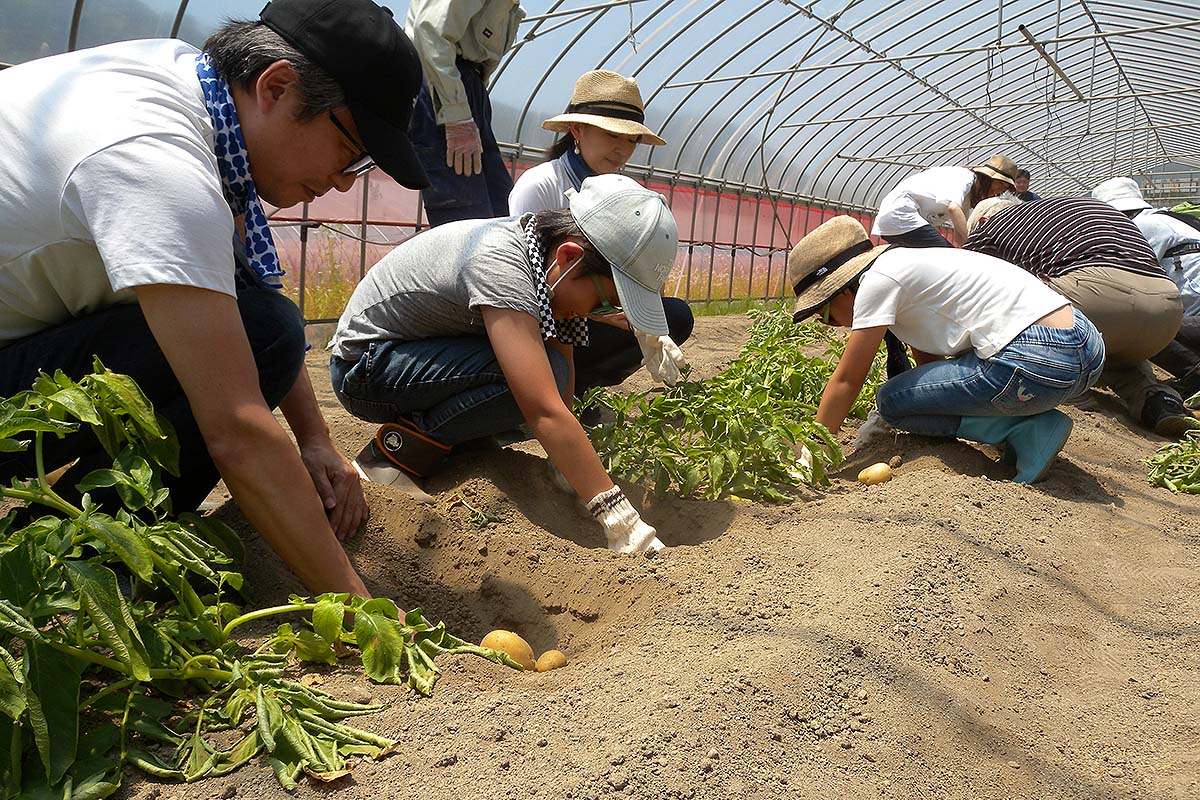 当日は、契約農家の城崎さんの専用ビニールハウスでじゃがいもをホリホリ。