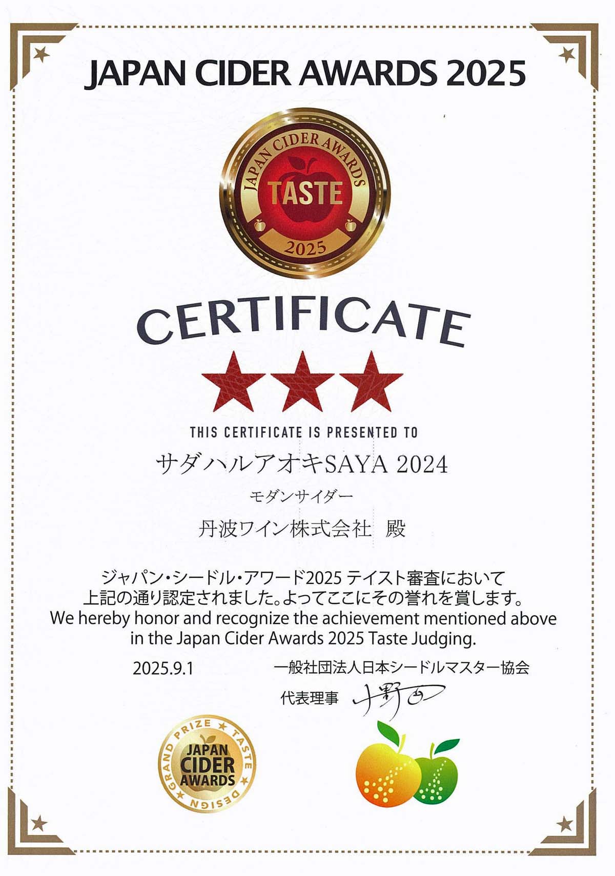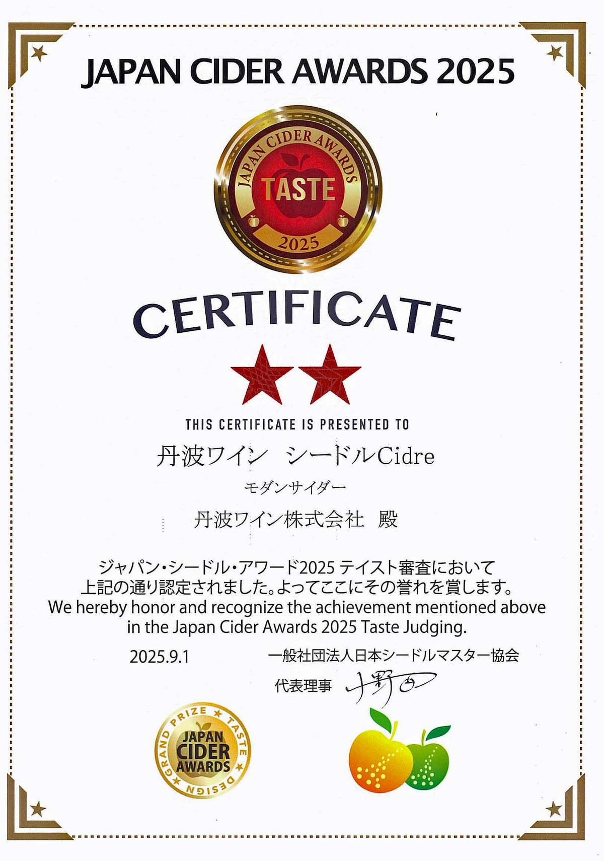 日本シードルマスター協会が主催する「ジャパンシードルアワード2025」のテイスト部門で、丹波ワインの「シードル」が2つ星を受賞しました。