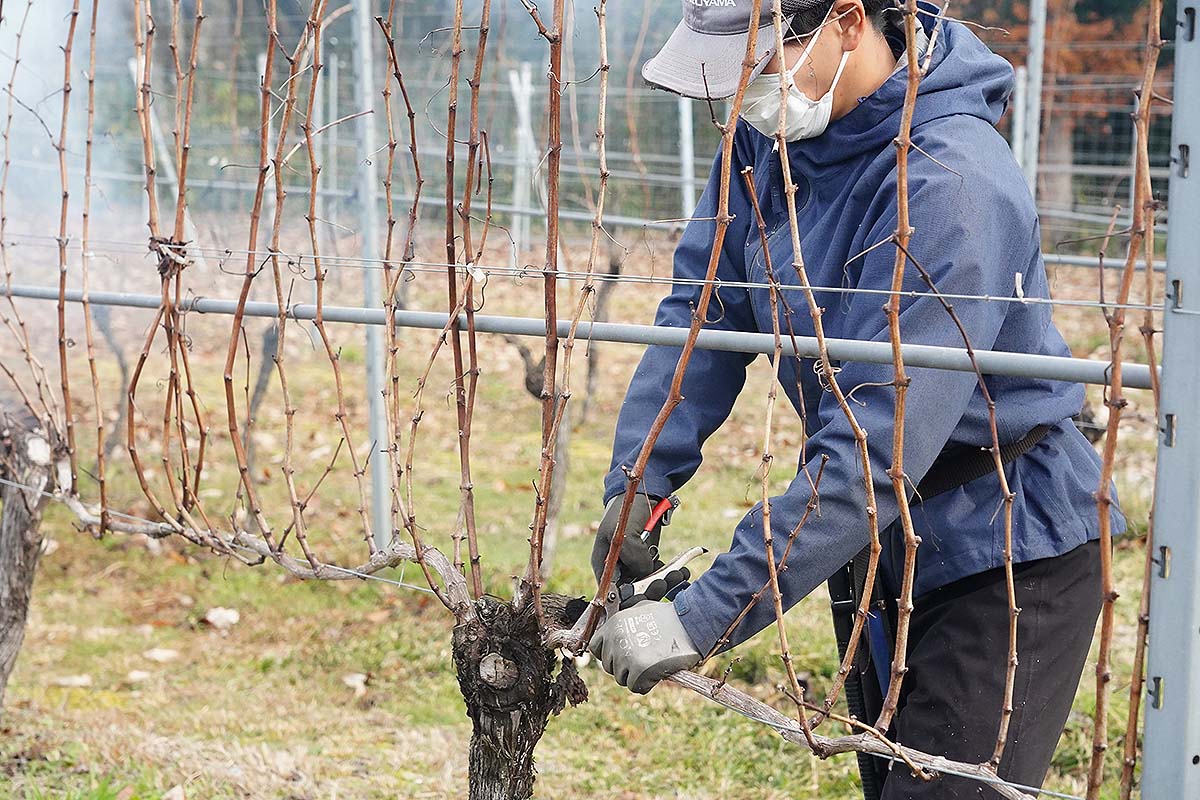 ぶどうは冬の間休眠期として活動を停止するので、その間に来年伸ばす枝を予測しながら母枝を残して余分な枝を取り除きます。