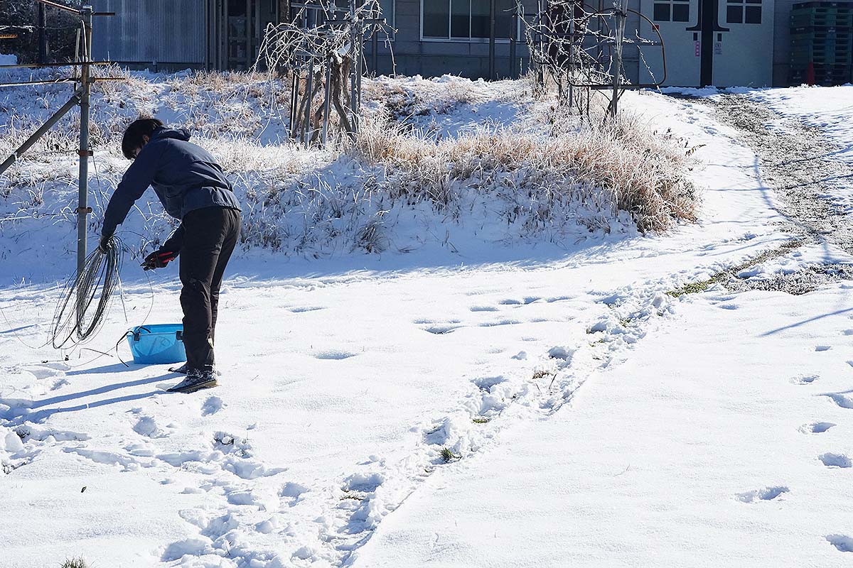 農園では冬剪定も終わり、鋼線の修復など傷んだ箇所を随時直していきます。