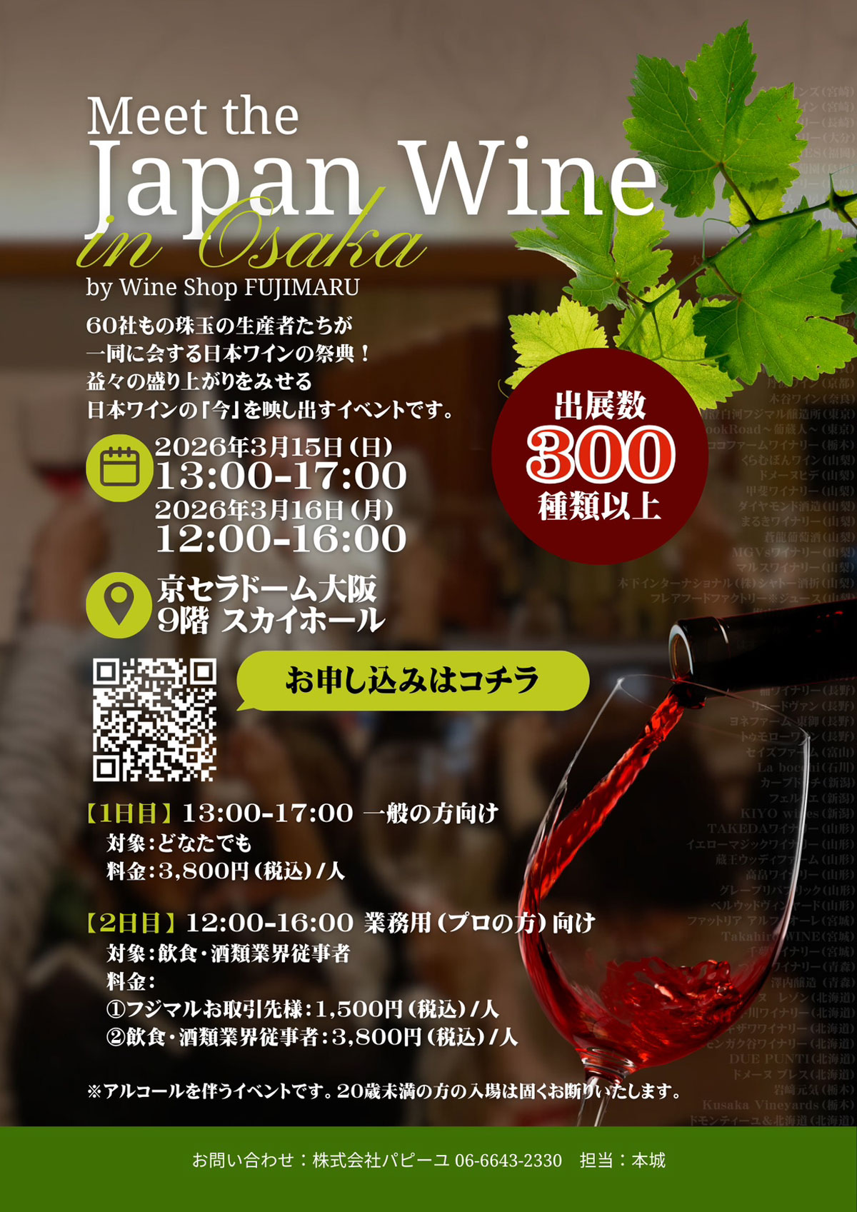 今年も日本ワインの魅力を発信するワインイベント「Meet the Japan Wine in OSAKA」が、2026年3月15日(日)、16日(月)の2日間、京セラドーム大阪 9階スカイホールにて開催されます。