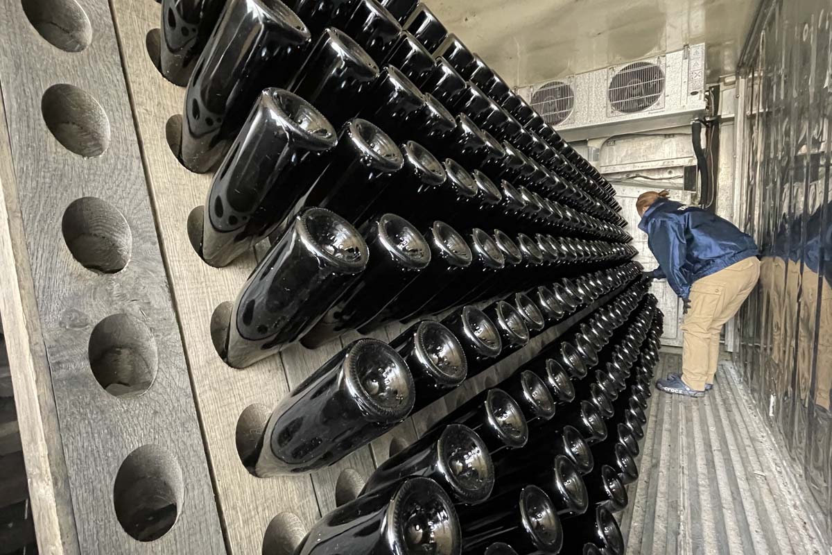 二次発酵によって生じたワイン中の澱を取り除くため、穴の開いた専用の板「ピュピトル」に瓶を逆さにした状態で斜めに挿し、それを一日少しずつ回しながら徐々に倒立させていき、瓶口に澱を集めます。