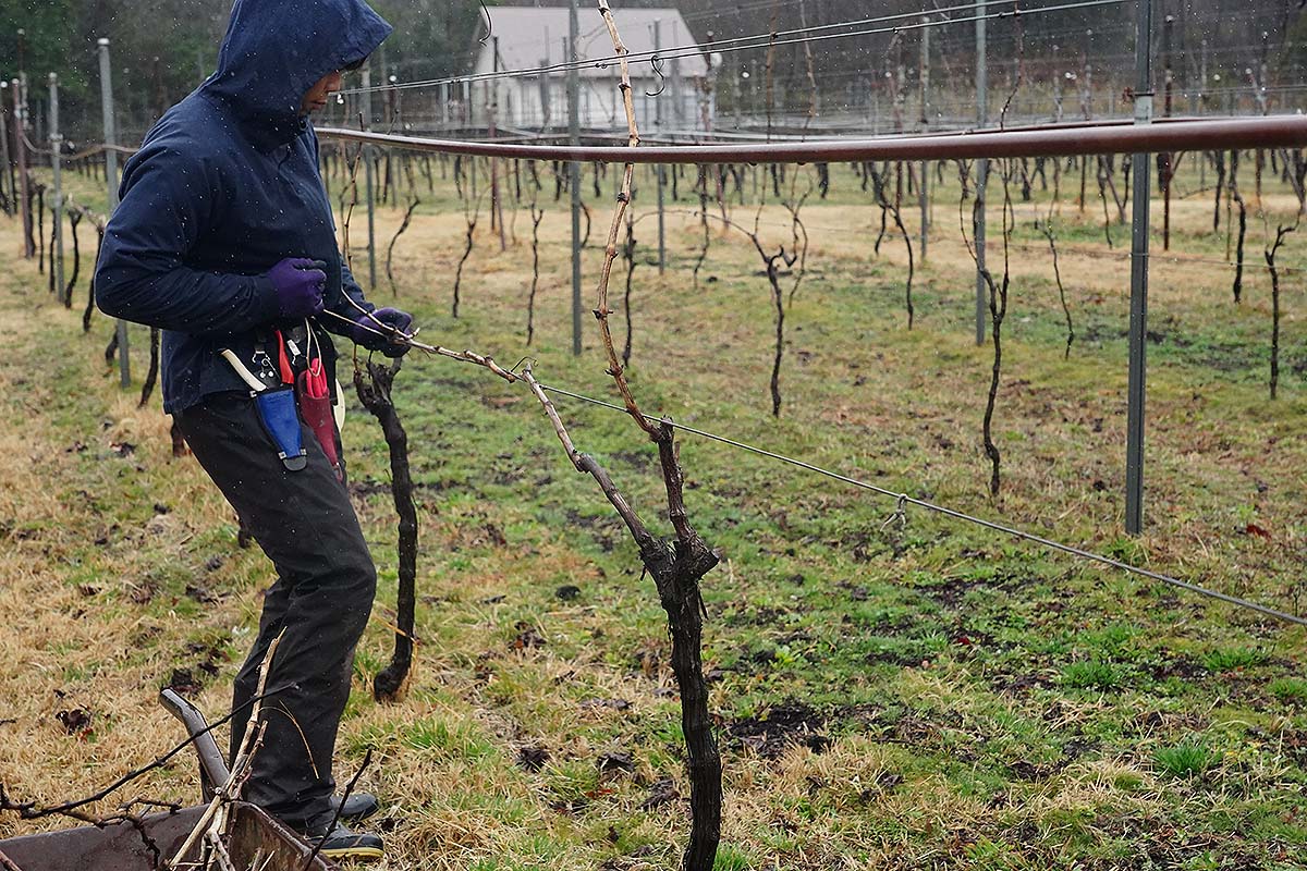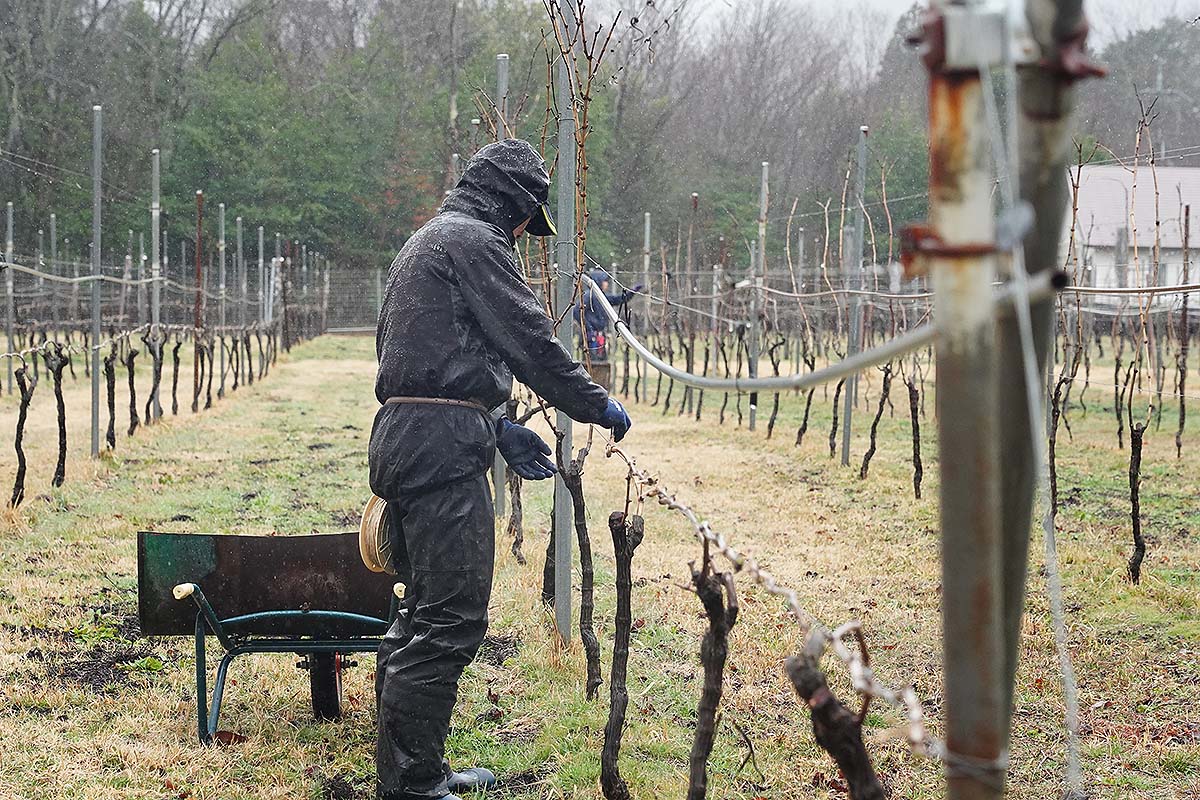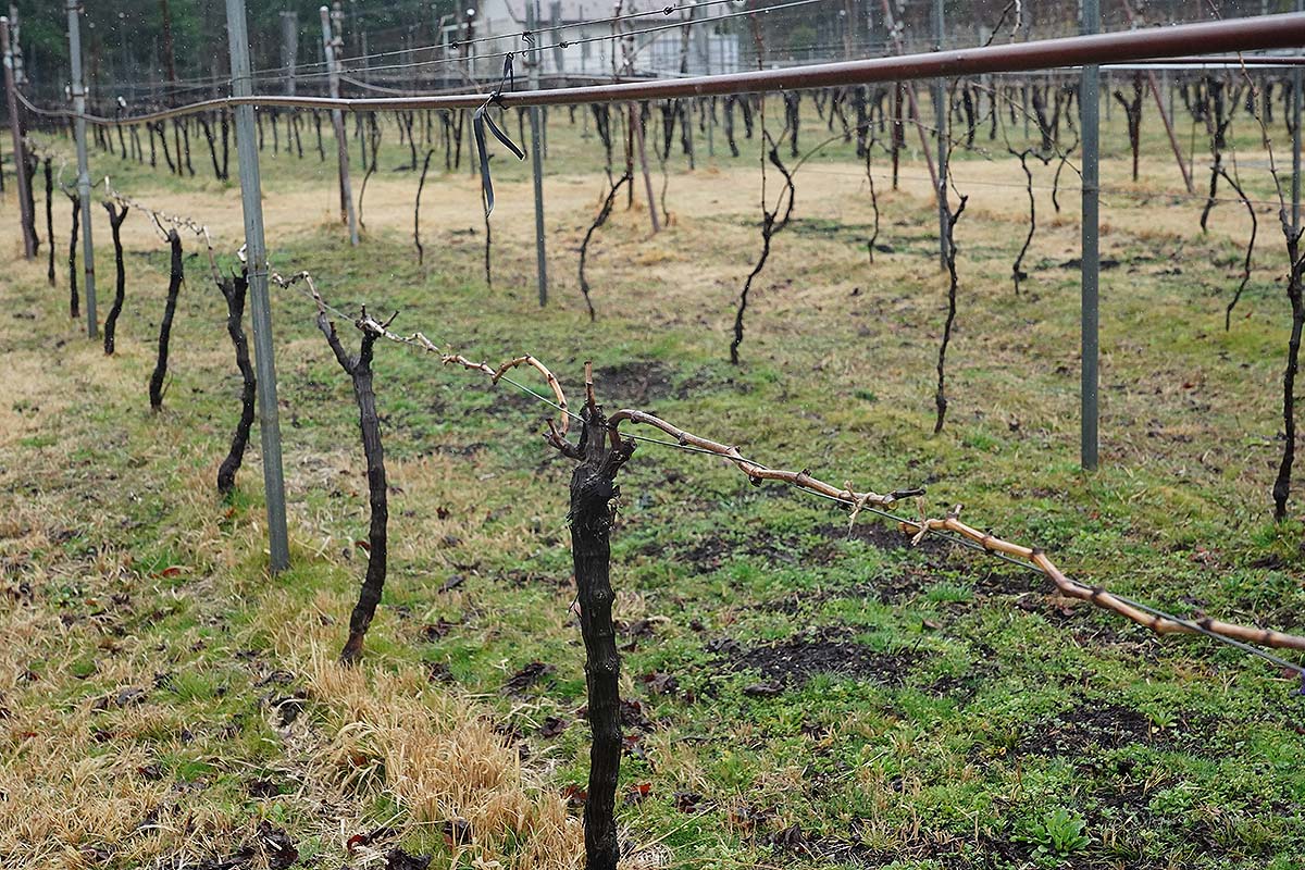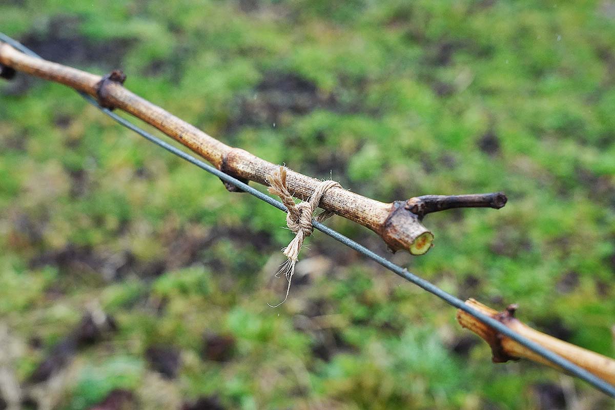 今はただの枝ですが、ここから新梢が伸びて房が実るので、その重みに耐えられるよう、今のうちにしっかりとくくりつけておく必要があります。