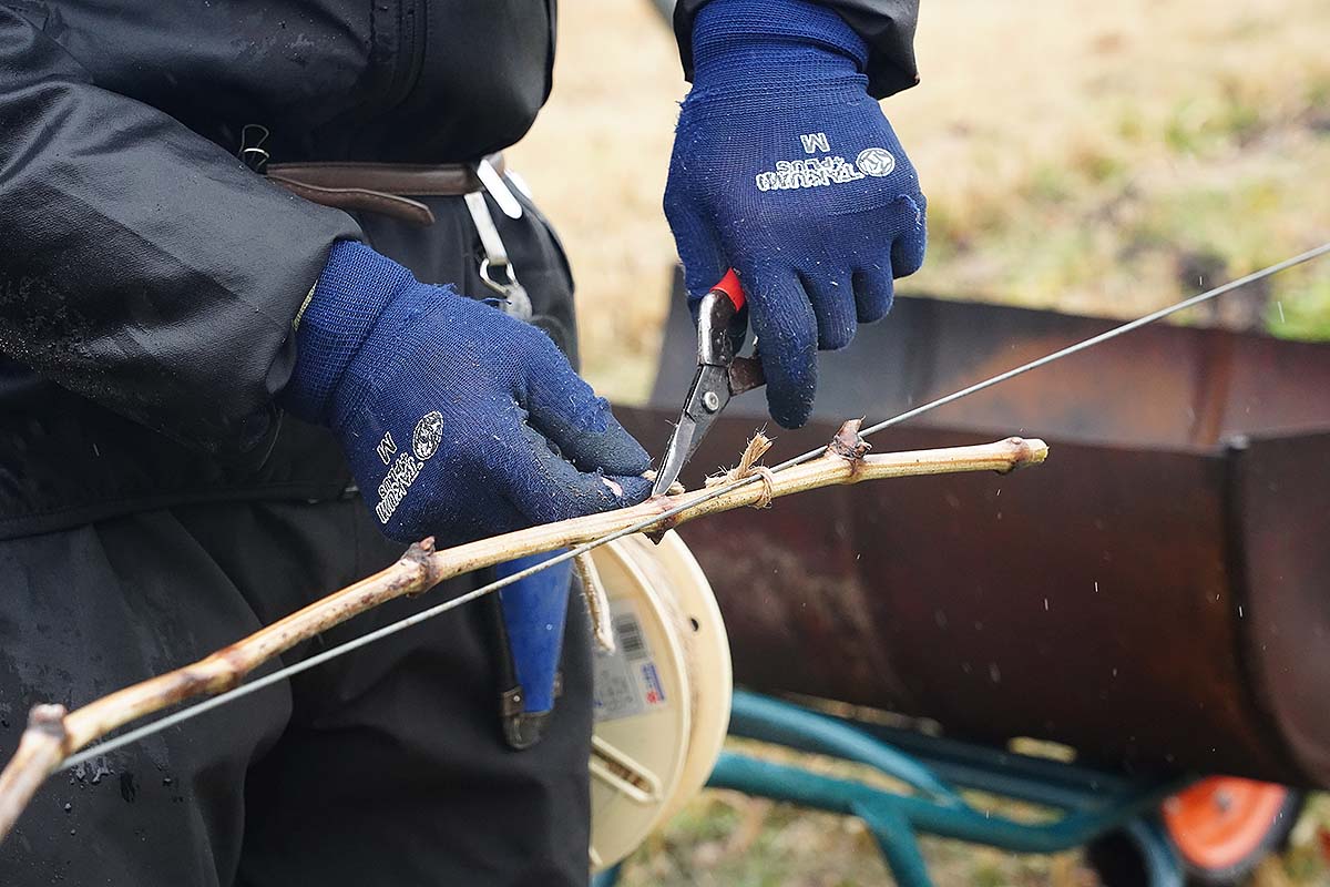 まだ固い枝を折らないようにそっと横倒しにし、ワイヤーへぐるぐると巻きつけた後、枝の先を結んでおきます。