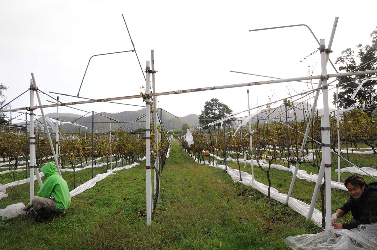 ほぼ収穫は終わっておりましたが遅摘みのセミヨンが支柱から外れ、雨よけも無残に…。