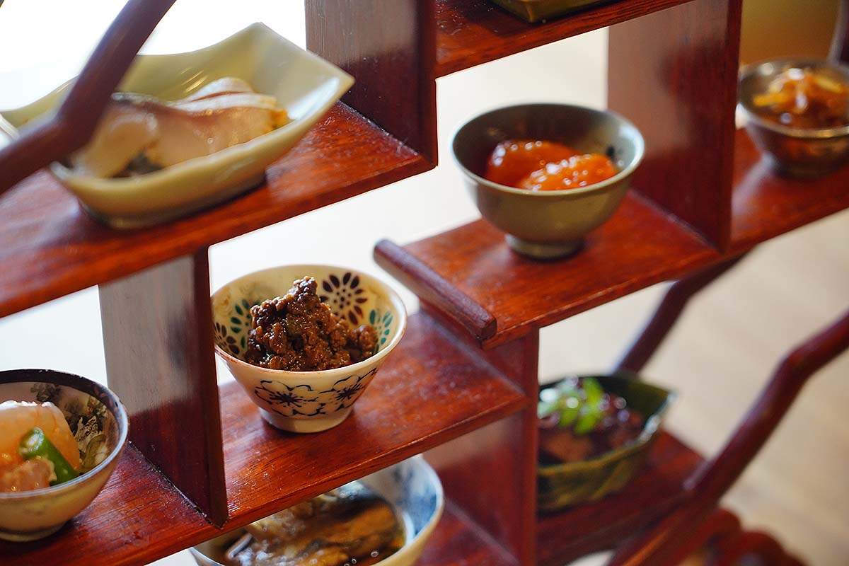 取材時(八月)には、鱧の子のゼリー寄せ、鯖のへしこ、蛸柔らか煮、卵黄味噌漬け、鴨ミンチ味噌、秋刀魚時雨煮、干し貝柱、甘海老塩麹和えという八種が並びました。一品一品に季節の香りが漂い、訪れるたびに新しい感動をもたらしてくれます。